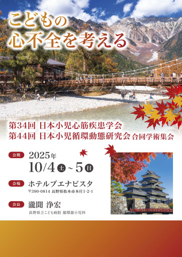 御 礼 第34回日本小児心筋疾患学会第44回日本小児循環動態研究会 合同学術集会はお陰様をもちまして盛会裡に終了いたしました。ご参加いただきました皆様、ご協力いただきました関係者の皆様に深く感謝申し上げます。 座長・発表者の皆様へ 詳しくはこちら 参加者へのご案内 詳しくはこちら プログラム・日程表 詳しくはこちら 各種資料 ポスター(PDF) プログラム・抄録集(PDF) 新着情報 2025年9月24日 プログラム・抄録集を掲載しました 2025年9月12日 表彰式・全体懇親会は参加無料となります 2025年9月12日 参加受付は当日現地のみとなります 2025年9月12日 当日のご案内とプログラムを公開しました 2025年8月25日 インスタアカウントを作成しました 過去の記事一覧